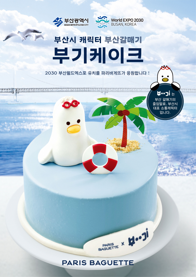 △SPC그룹의 베이커리 브랜드 파리바게뜨가 2030부산세계박람회 유치를 홍보하고, 부산시 소통 캐릭터인 부기의 인지도를 높이기 위해 부산시와 협업해 부산시 소통 캐릭터인 부기(Boogi)를 캐릭터로 한 '부기 케이크'를 한정 출시한다. 오직 부산과 경남지역 파리바게뜨 매장 400여 곳에서 판매되는 지역 한정 제품으로, 부산시를 대표하는 인기 캐릭터인 '부기'와 협업해 선보인 이색 케이크다. 푸른 부산의 여름 바다에 퐁당 빠진 부기를 모티브로 제작한 초코케이크다. 연하늘색 초콜릿을 덮어 바다를 표현하고, 초콜릿 시트에 바삭바삭한 크런치를 넣어 식감에도 재미를 더했다. 또한 부기 입체 모형과 야자수, 튜브 등 아기자기한 소품을 올려 재미있는 스토리를 담아낸 것이 특징이다. 부산시를 대표하는 소통 캐릭터인 부기는 부산갈매기를 모티브로, 부산의 상징인 갈매기를 귀엽고 친근한 캐릭터로 구현한 것이 특징이다.