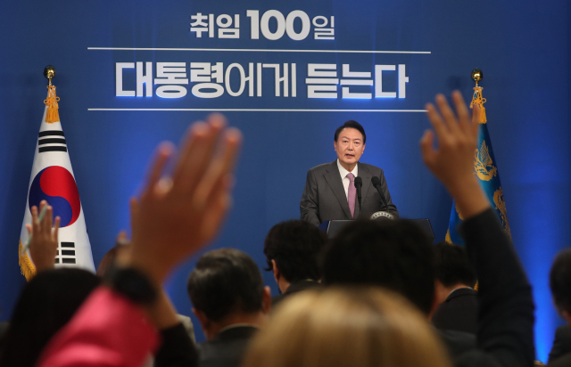 윤석열 대통령이 17일 서울 용산 대통령실 청사에서 열린 취임 100일 기자회견 '대통령에게 듣는다'에서 기자들의 질문을 받고 있다. 연합뉴스