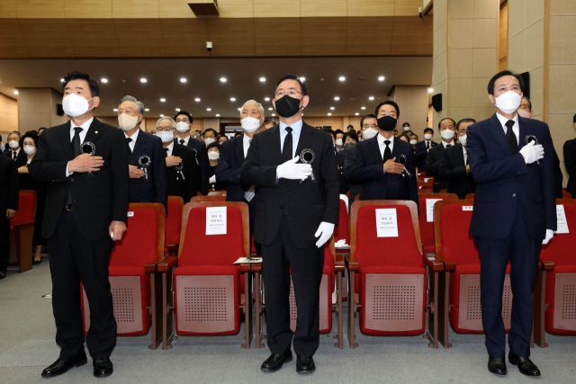 18일 국립서울현충원 현충관에서 열린 김대중 전 대통령 서거 13주기 추도식에서 김진표(왼쪽) 국회의장 등 참석자들이 국민의례를 하고 있다. 국회사진기자단