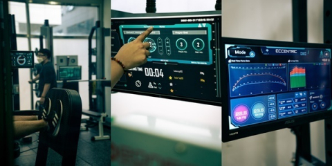 론픽의 피트니스 기기를 통해 운동하는 모습과 디스플레이. 부산일보DB
