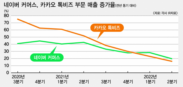 2분기에 2조 원이 넘은 역대 최대 매출을 기록한 네이버의 경우 ‘이커머스'(전자상거래) 분야의 성장률 둔화가 본격화되는 모습을 보이고 있다. 네이버가 ‘커머스’ 부문의 실적을 발표하기 시작한 2020년 3분기 이후 2021년 2분기까지 커머스는 4분기 연속 40%가 넘는 높은 성장세를 이어왔다. 특히 코로나19로 ‘비대면 거래’가 폭증하면서 네이버 커머스도 ‘코로나 특수’를 누렸다.