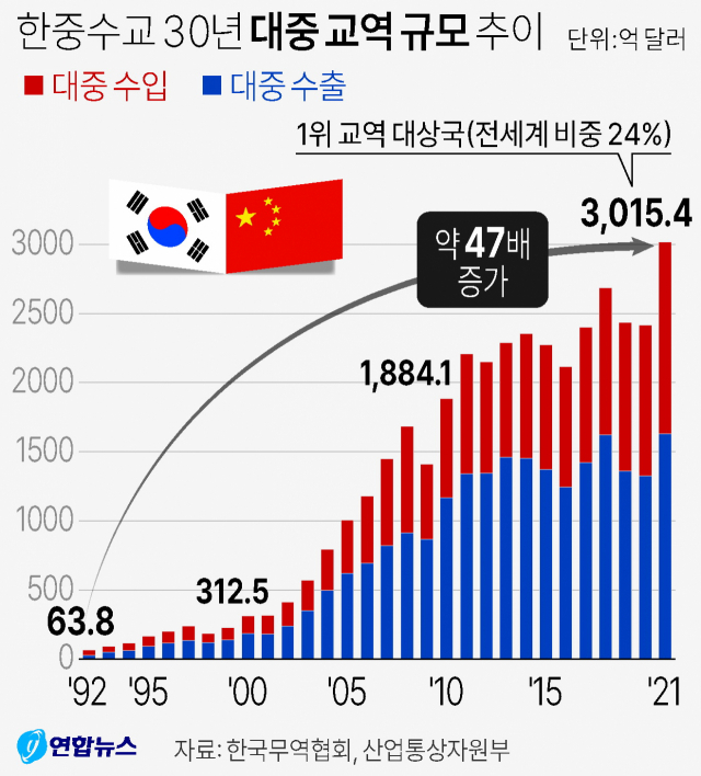 23일 한국무역협회에 따르면 지난해 한국의 대중 수출액은 1629억 1300만 달러(약 218조 7000억 원)로 한·중 수교 직전 해인 1991년의 10억 300만 달러 대비 162.4배로 확대됐다.