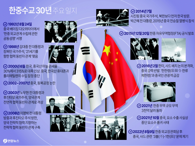 24일 수교 30주년을 맞은 한국과 중국이 가속화되는 신냉전 체제에서 어떤 관계를 정립할지 주목된다. 사드(THAAD·고고도미사일방어체계), 칩4, 한한령(限韓令·한류제한령) 등 민감한 현안 속 한국 정부가 균형 잡힌 외교로 실용과 안보를 모두 잡을지 주목된다. 칩4는 미국 정부가 한국, 일본, 대만을 포함해 구축 중인 반도체 동맹이다.
