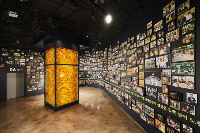 ‘깨어있는 시민 문화체험전시관’ 전경과 ‘바보 노무현, 그리고 노사모’를 담은 제5전시실, 노 전 대통령 탄생과 시대 상황을 알리는 제1전시실 내부(위에서부터). 김해시 제공