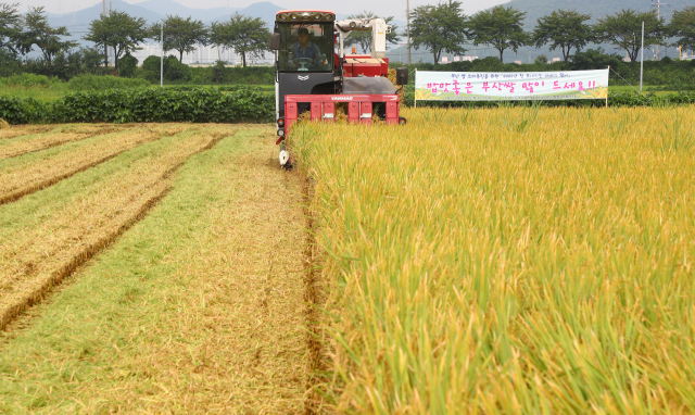 이달 말부터 일부 조생종 벼의 수확이 시작됐다. 하지만 최근 쌀값이 45년 만의 최대 낙폭을 기록하면서 전국 농민들이 잇따라 정부에 대책을 촉구하고 있다. 지난 23일 부산 강서구 죽동동의 한 논에서 진행된 부산 지역의 첫 벼 수확 장면. 정종회 기자 jjh@busan.com