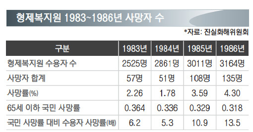 1986년 기준 형제복지원 수용자 사망률은 같은 해 65세 이하 국민 사망률보다 13.5배나 높았다. 또 형제복지원 사망자의 평균 수명은 일반 인구에 비해 25년이 적은 것으로 드러났으며, 여성이 남성에 비해 현저하게 낮은 것으로 조사됐다. 특히 이번 조사를 통해 당시 형제복지원 측이 시신을 임의로 가매장하고 허위 사망진단서로 사인까지 은폐한 것으로 드러났다. 이는 과거 형제복지원 내부에서 만연했던 구타, 성폭행 등 가혹행위와 비전문적 의료행위, 수용자 부실 관리 등 참상을 단면적으로 보여 주는 근거다.