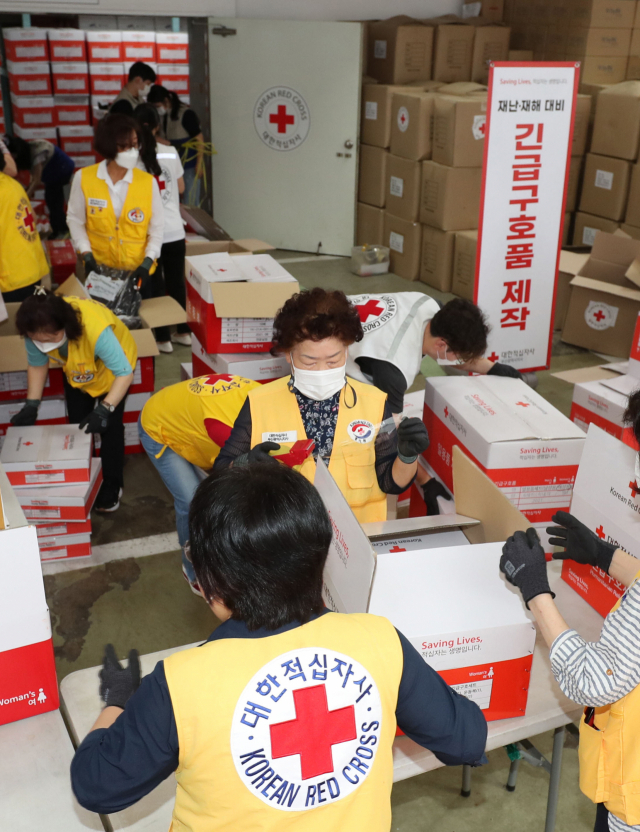 대한적십자 부산지사 직원과 청소년적십자 단원, 자원봉사원 등이 25일 부산 부산진구 부산적십자회관 구호창고에서 이재민 긴급 구호품 세트를 제작하고 있다. 이날 제작한 구호품은 재해 발생 시 이재민에게 제공된다.
