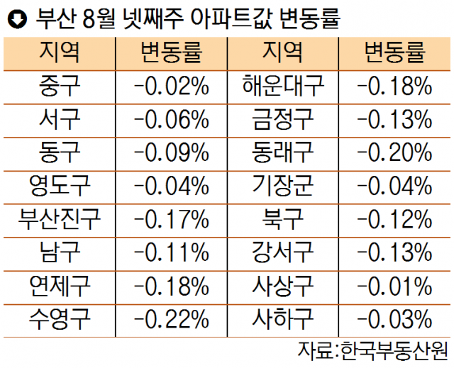 한국부동산원은 “해운대구의 경우 좌동 신시가지 지역에서 매물이 늘면서 다른 곳보다 조금 더 하락했고 수영구는 재건축 대상 단지 가격이 떨어졌다”며 “동래구는 낙민동 쪽이 다른 곳보다 많이 떨어졌고, 부산진구는 초읍동과 양정동에서 하락폭이 좀더 깊었다”고 말했다.
