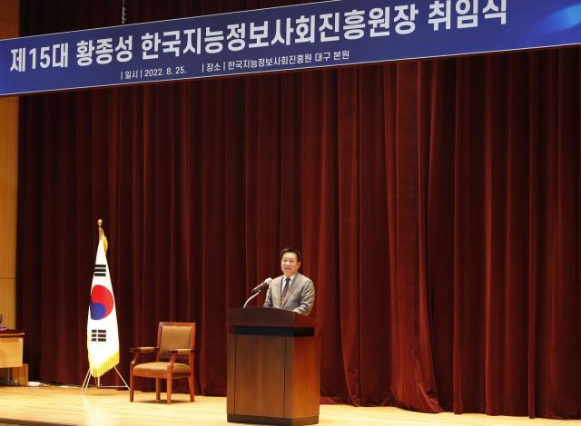 한국지능정보사회진흥원(NIA)은 25일 NIA 대구본원에서 황종성 제15대 한국지능정보사회 진흥원장의 취임식을 개최했다. NIA 황종성 신임원장이 취임사를 하고 있다. NIA 제공