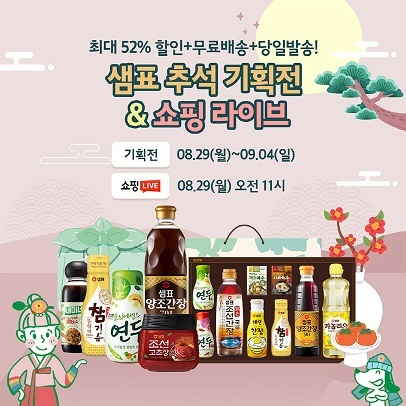 △샘표가 29일부터 9월 4일까지 한가위 특별전을 진행한다. 명절 음식 준비에 빠질 수 없는 새미네부엌 쇠고기 야채 잡채소스, 요리에센스 연두, 샘표 양조간장 701 등을 최대 52% 할인된 가격에 판매한다. 9월 4일까지 진행되는 특별전에서는 팬 하나로 잡채를 10분만에 완성할 수 있는 새미네부엌 잡채소스, 삼색 나물 본연의 맛과 향을 한껏 살리면서 감칠맛을 더해주는 순식물성 콩발효 에센스 연두, 갈비 양념의 풍미를 높여줄 양조간장 701, 국물요리를 손쉽게 만들어주는 사골육수 등을 특별한 혜택과 함께 만나볼 수 있다. 음식 준비에 필요한 제품뿐 아니라, 귀성길 간식은 물론 명절 스트레스 해소에 안성맞춤인 질러 육포를 골라 담을 수 있는 구성도 준비했다. 라이브 방송 중 구매왕을 선정해 '샘표 선물세트 정성S호'를 증정하는 이벤트도 함께 마련했다. 프로모션 첫날인 29일 오전 11시에는 네이버 쇼핑 라이브를 진행한다. 샘표는 방송을 통해 쉽고 맛있게 명절 음식을 만들어주는 제품들을 선보이고, 추석 명절 음식 쉽고 맛있게 만드는 방법 등을 공유하며 소비자와 실시간으로 소통할 예정이다.