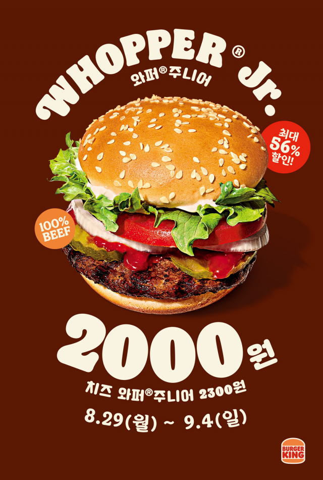 △프리미엄 버거 브랜드 버거킹이 추석을 기념하며 '와퍼주니어'를 최대 56% 할인된 가격에 만나볼 수 있는 프로모션을 진행한다. 버거킹의 시그니처 메뉴인 '와퍼'를 더욱 가볍게 즐길 수 있는 와퍼주니어는 불에 직접 구운 100% 순 쇠고기 패티가 싱싱한 야채를 만나 깊은 풍미와 감칠맛을 자랑한다. 이번 추석맞이 특별 프로모션에서는 와퍼주니어와 불고기 와퍼주니어 단품은 기존 프로모션보다 큰 폭으로 56% 할인된 2000원에, 치즈 와퍼주니어 단품은 2600원 할인된 2300원에 즐길 수 있다. 이번 할인 프로모션은 딜리버리와 일부 매장을 제외한 전국 버거킹 매장에서 진행되며, 1인당 최대 5개까지 구매할 수 있다. 다른 할인·쿠폰과 중복 혜택 적용은 불가능하다.