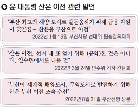 산은 이전은 윤 대통령이 대선 기간인 올해 1월 부산을 방문해 ‘깜짝’ 발표한 지역 대표 공약이다. 윤 대통령은 대통령직 인수위원회에서도 “표를 얻기 위해 한 공약이 아니다. 지역균형발전에 필수적”이라며 강력한 추진 의사를 밝힌 바 있다.