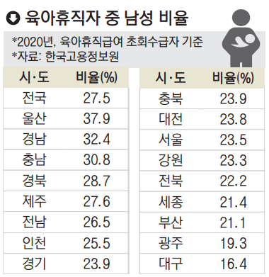 한국고용정보원에 따르면 2020년 기준 부산지역 전체 육아휴직급여 초회수급자 중 남성이 차지하는 비율은 21.1%에 그쳤다. 전국 평균인 24.5%에 못 미치는 것은 물론이고 대구시(16.4%), 광주시(19.3%) 등과 함께 17개 시·도 가운데 최하위 수준이다. 울산시(37.9%)와 경남(32.4%)가 각각 1위와 2위로 최상위권인 것과도 대조된다.