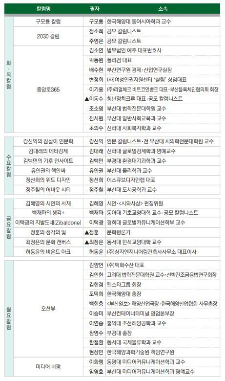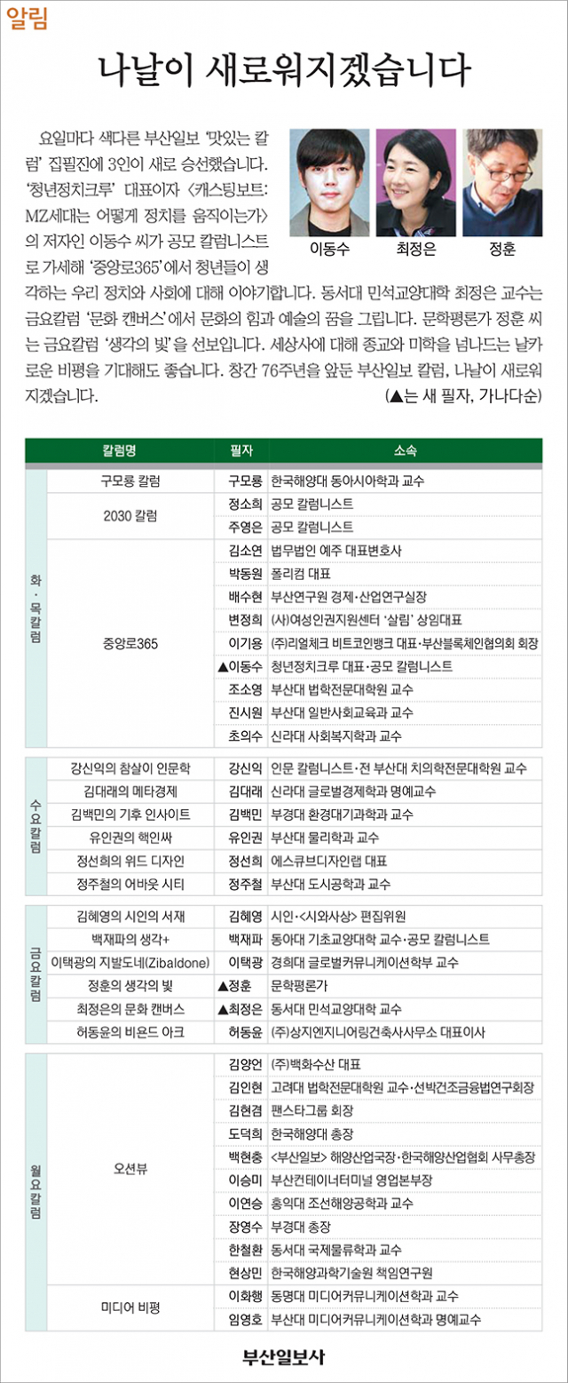 요일마다 색다른 부산일보 ‘맛있는 칼럼’ 집필진에 3인이 새로 승선했습니다. ‘청년정치크루’ 대표이자 〈캐스팅보트: MZ세대는 어떻게 정치를 움직이는가〉의 저자인 이동수 씨가 공모 칼럼니스트로 가세해 ‘중앙로365’에서 청년들이 생각하는 우리 정치와 사회에 대해 이야기합니다. 동서대 민석교양대학 최정은 교수는 금요칼럼 ‘문화 캔버스’에서 문화의 힘과 예술의 꿈을 그립니다. 문학평론가 정훈 씨는 금요칼럼 ‘생각의 빛’을 선보입니다. 세상사에 대해 종교와 미학을 넘나드는 날카로운 비평을 기대해도 좋습니다. 창간 76주년을 앞둔 부산일보 칼럼, 나날이 새로워지겠습니다. (▲는 새 필자, 가나다순)