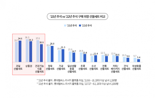 올해 추석 선물로는 과일세트와 상품권, 건강기능식품 등이 인기를 끌 전망이다. 롯데멤버스가 리서치 플랫폼 라임(Lime)을 통해 전국 성인 남녀 2000명 대상 '2022년 추석 선물 계획 설문조사(표본오차 95% 신뢰수준에서 ±2.2%포인트)'를 실시했다고 1일 밝혔다.