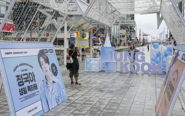 방탄소년단(BTS) 정국의 생일을 맞아 1일 중국 팬클럽 '정국 차이나'가 부산 해운대구 구남로에서 '불빛 터널' 서포트를 진행하고 있다. 김종진 기자 kjj1761@