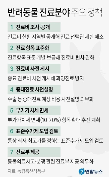 아울러 정부는 전국의 4900여개 동물병원 진료비를 조사해 시도와 시군구별로 최저·최고비용 등 진료비를 소비자들에게 공개할 예정이다.