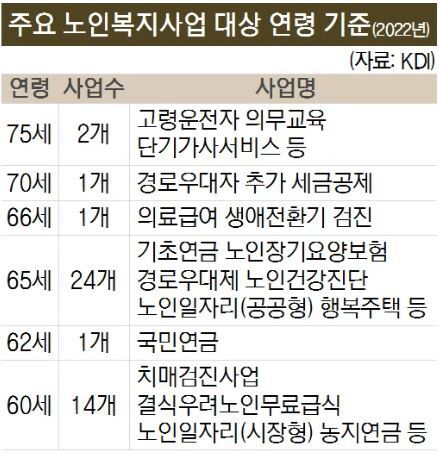 이에 보고서는 노인 개념의 재검토가 필요하다고 주장했다. 노인복지법상 노인연령 기준은 만 65세인데 1981년에 제정된 이후 변동없이 약 40년간 유지되고 있다. 49개 노인복지사업의 24개 사업이 수급연령을 65세 이상으로 삼고 있다.
