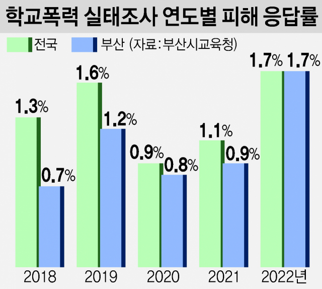 부산지역의 학교폭력 증가폭은 더 컸다. 20만 9036명(92.5%)이 참여한 조사에서 피해 응답률은 1.7%로 전국 평균과 비슷했지만, 1년 전(0.9%)에 비해 배 가까이 증가했고 2019년보다도 0.5%P 늘었다.