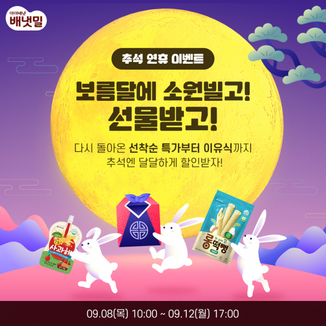 △영유아 식품 전문기업 아이배냇의 신선배달 이유식 브랜드 배냇밀이 8일부터 12일까지 추석 연휴 이벤트를 진행한다. 이벤트 기간 동안 선착순 릴레이 특가, 한우 이유식 특가 등에 참여할 수 있다. 이 기간 매일 오전 10시에는 선착순 릴레이 특가가 열린다. 매일 선착순 20명에 한해 8일은 오늘사과해 10입, 9일은 롱떡뻥 6개 세트, 10일은 곡물친구 6개 세트, 11일은 유기농 쌀떡뻥 5종, 12일은 끙아A 10입을 990원에 구매할 수 있다. 한우 단품 이유식·유아식은 15% 할인된 가격으로 만나볼 수 있다. 유기농 국산 보리를 분쇄 없이 로스팅하고 중탕 추출 방식으로 우려내 순한 맛과 영양을 살린 '처음 보리차'는 40% 할인된 가격으로 구매할 수 있고, 구매 시 배냇밀몰에서 사용 가능한 3000마일리지도 받을 수 있다. 댓글 이벤트에도 참여할 수 있다. 이벤트 페이지 내 댓글란에 '돌아오는 추석에 보름달에게 빌고 싶은 소원'을 남기면, 추첨을 통해 5명은 CU 1만 원 상품권, 10명은 스타벅스 아메리카노 쿠폰을 받을 수 있다.
