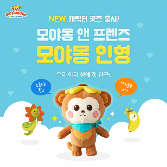 △천재교육이 자체 개발한 캐릭터 브랜드 '모야몽 앤 프렌즈'의 대표 인기 캐릭터인 모야몽 인형을 출시한다. 모야몽 앤 프렌즈는 천재교육이 자체 개발한 캐릭터 브랜드로, 자사 영유아 교육 브랜드인 '리틀천재'의 영유아 전집 '돌잡이' 시리즈 적용·각 분야의 토이북(한글, 영어, 수학, 명화 등)과 전용펜 등에 다양하게 활용되고 있다. 영상 플레이어인 '모야몽 스마트 박스'를 통해 다양한 콘텐츠로 활용되는 등, 흥미로운 학습을 이끌며 영유아 교육 시장의 새로운 트렌드를 만들어 나가고 있다. 커다란 3단 모양의 케이크섬에 살고 있다는 스토리 설정은 물론, 모야몽(원숭이)과 바나(바나나), 호치(호랑이), 독구(강아지), 퐁(양), 디디(용), 이뽀(뱀) 등, 친근감을 더하는 캐릭터 구성으로 영유아의 자연스럽고 즐거운 놀이 기반 학습 콘텐츠에 힘을 더하며 아이들은 물론 학부모들 사이에서 좋은 반응을 얻고 있다. 캐릭터 굿즈로 출시된 모야몽은 모야몽 앤 프렌즈의 대표 캐릭터로 호기심 많은 개구쟁이 콘셉트를 반영한 귀여운 디자인은 물론, 부드러운 촉감으로 베개나 쿠션 등 다양한 용도로 활용이 가능하다. 영유아 맞춤형 사이즈로 애착인형으로도 손색이 없어 심리적 안정감을 제공해 정서 발달에도 도움을 준다. 천재교육 공식 쇼핑몰을 통해 구매 가능하다.