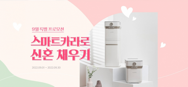 △친환경 음식물처리기 스마트카라가 신혼가전으로 각광받고 있는 음식물처리기를 다양한 혜택과 함께 제공하는 9월 특별 프모로션을 진행한다. 대상 제품은 '스마트카라 400 Pro', '스마트카라 400 Pro 스토리지 타워 패키지'다. 9월 한 달간 프모로션 대상 제품 구매 고객 전원에게 에코필터 2세트, 신세계 모바일 상품권(3만 원), 빌레로이앤보흐 '보스톤 와인 고블렛잔 2P'을 100% 증정한다. 9월 구매 고객에게만 주어지는 스페셜 추첨 혜택도 준비했다. 스마트카라 400 Pro 구매 고객 중 추첨을 통해 당첨된 고객에게는 휴롬 이지착즙기(1명), 제니퍼룸 오븐토스트(3명), 락앤락 스피드쿡 냄비 2종(10명), 스타벅스 카페 아메리카노(20명)을 선물한다.