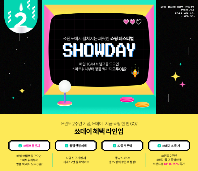 △신원의 온라인 종합 패션플랫폼 '쑈윈도'가 론칭 2주년을 맞아 오는 16일부터 30일까지 사상 최대 규모의 세일페스타를 진행한다. 2020년 9월 론칭한 쑈윈도의 론칭 2주년을 기념하기 위해 마련된 것으로, 브랜드별 최대 90%의 할인을 비롯해 경품 응모와 신규 회원 추가 혜택, 페이코·카카오톡 플러스친구 채널 추가 할인 등으로 다채롭게 구성됐다. 먼저, 쑈윈도 로그인과 이벤트 참여 시 획득이 가능한 '쑈템프' 개수에 따라 경품에 응모할 수 있는 기회가 주어진다. 쇼템프를 1개 획득한 모든 소비자에겐 5000원 할인쿠폰이 주어지며, 3개 획득 시 갤럭시워치 5 응모권(5명 제공), 7개 획득 시 에어팟 맥스 응모권(3명 제공)을 증정한다. 쑈템프 12개를 획득한 고객 중 1명에게는 300만 원 상당의 구찌 미니백이 경품으로 증정될 예정이다. 처음 가입하는 회원에게는 기존보다 배가 된 혜택이 주어진다. 이벤트 기간 중 가입하는 신규 회원에게는 웰컴쿠폰 20% 할인권과 더불어 가입 축하 마일리지 1만 쑈마일이 주어지며, 쑈윈도 앱을 다운 받은 신규 회원에게는 1만 쑈마일을 추가로 증정한다. 9월 한 달 간 10% 추가 할인을 제공하는 페이코 결제 이벤트는 17~19일 3일 동안 5만원 한도 내에서 30% 할인으로 확대해 진행한다. 쑈윈도 카카오톡 플러스친구 채널 가입 시에는 중복사용이 가능한 5% 할인 쿠폰을 제공해 할인 혜택을 더욱 늘렸다.