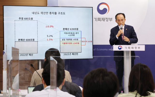 추경호 경제부총리 겸 기획재정부 장관이 지난달 25일 정부세종청사에서 2023년도 예산안과 관련해 상세 브리핑을 하고 있다. 연합뉴스