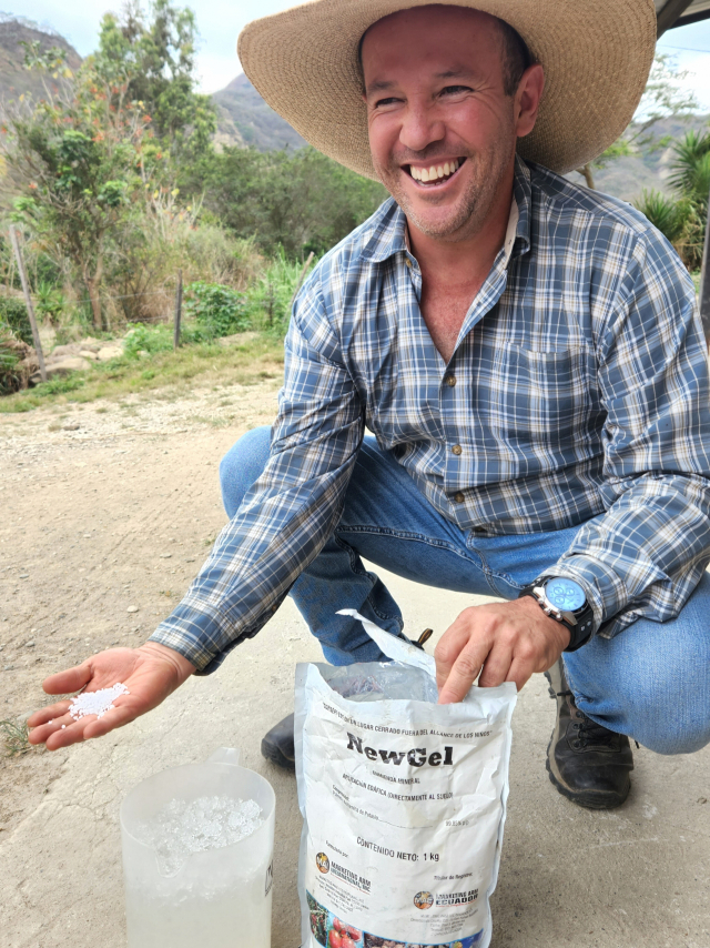 ‘아그로 로하’ 농장의 앙헬 레예스 씨가 커피나무에 수분을 공급하기 위해 토양에 섞는 젤을 보여 주고 있다.