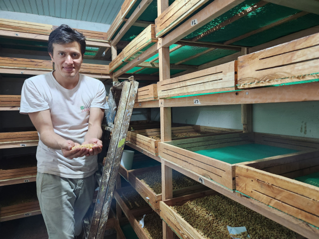 ‘라 플로리다’ 농장의 파브리시오 코로넬 필코 씨가 잘 설계된 건조실에서 말리는 커피 생두를 보여 주고 있다.