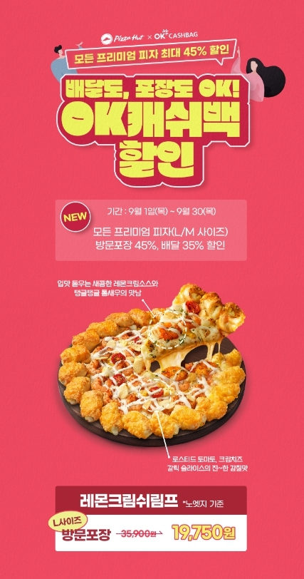 △한국피자헛이 9월 한 달간 OK캐쉬백과 함께 배달 주문 고객에게는 35%, 방문 포장 고객에게는 45% 할인 혜택을 제공하는 프로모션을 진행한다. OK캐쉬백과 시럽 앱을 통해 프리미엄 피자 주문 시 이용 가능한 '피자헛 할인 쿠폰'을 발급받아 사용할 수 있다. 피자헛 홈페이지·앱의 마이페이지 쿠폰함에서 할인쿠폰 번호 12자리를 입력하면 할인 혜택이 적용된다. 프리미엄 피자 전 사이즈를 대상으로 하는 쿠폰은 9월 30일까지 사용할 수 있고, 홈페이지·앱을 통해서만 주문 가능하다. 올 8월 출시돼 큰 인기를 끌고 있는 기간 한정 신제품 '레몬크림쉬림프'에도 적용된다. 노엣지 기준 라지 사이즈 방문 포장 주문 시 45% 할인된 가격에 즐길 수 있다. 10월 31일까지 한정 판매되는 레몬크림쉬림프는 새콤탱글 레몬크림새우에 로스티드 토마토, 크림치즈, 갈릭 슬라이스를 더해 지중해의 풍미 선사한다.
