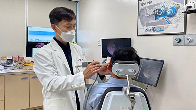 동아대학교병원 이비인후과 정성욱 교수가 난청환자에게 귀내시경검사를 시행하고 있다. 동아대병원 제공