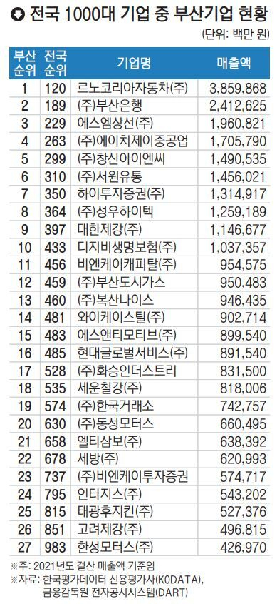 100대 기업으로 선정 범위를 좁힐 경우 부산 기업의 성적은 더욱 초라하다. 1년 전에 이어 이번 조사에서도 역시 단 1곳도 포함되지 못했다. 부산 기업 중 2021년 매출이 가장 높은 르노코리아자동차의 전국 순위는 120위다. 전년 조사(118위)에 비해 2계단 떨어졌다. 신차 출시 효과 감소와 경쟁력 약화 등 내수판매 부진의 영향으로 해석된다.