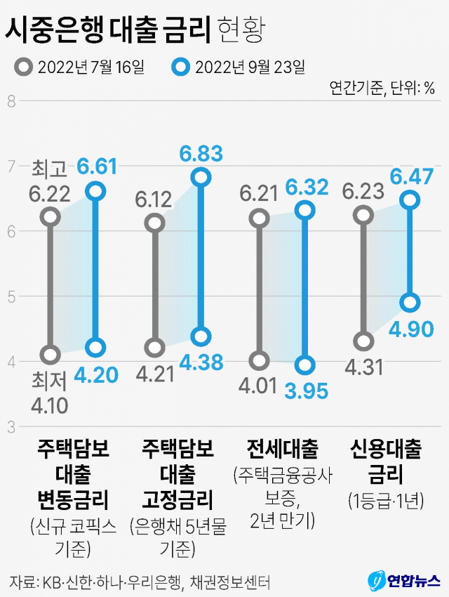 25일 금융권에 따르면 KB국민·신한·하나·우리은행의 주택담보대출 혼합형(고정형) 금리는 23일 기준 연 4.380∼6.829% 수준이다. 약 두 달 전인 7월 16일(4.210∼6.123%)과 비교해 상단이 0.706%포인트(P), 하단이 0.170%P 뛰었다.