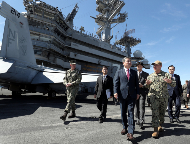 이종섭 국방부 장관이 24일 부산 해군작전기지에 한·미 연합훈련차 입항한 미 제5항모강습단의 로널드 레이건함을 찾았다. 아래 사진은 북한이 단거리 탄도미사일을 발사한 25일 부산역에서 한 시민이 뉴스를 보는 모습. 국방부 제공·김종진 기자 kjj1761@