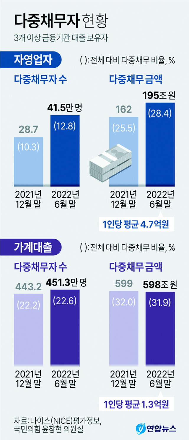 일반 가계 다중채무자도 451만 명을 넘어선 상황에서 예상보다 빠른 국내외 통화 긴축으로 대출금리가 계속 뛰면 이들 다중채무자의 상환 능력이 급격히 떨어져 결국 경제·금융 위기로 이어질 수 있다는 경고가 나온다.