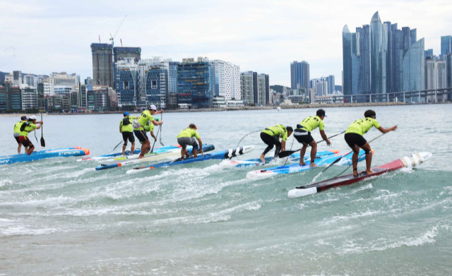 25일 부산 광안리해수욕장에서 열린 패들보드 대회(2022 APP WORLD TOUR BUSAN SUP OPEN) 참가 선수들이 파도를 헤치며 레이스를 펼치고 있다. 이번 대회는 2022년 패들보드 세계대회 일정 중 세 번째 순서로 열렸다. 연합뉴스