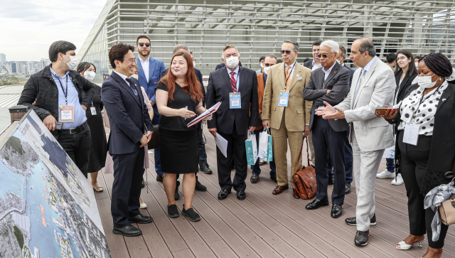 주한 외교사절단이 26일 오전 부산 동구 부산국제여객터미널 하늘공원에서 2030 부산엑스포 부지를 살펴보며 북항 통합개발 사업에 관해 설명을 듣고 있다.