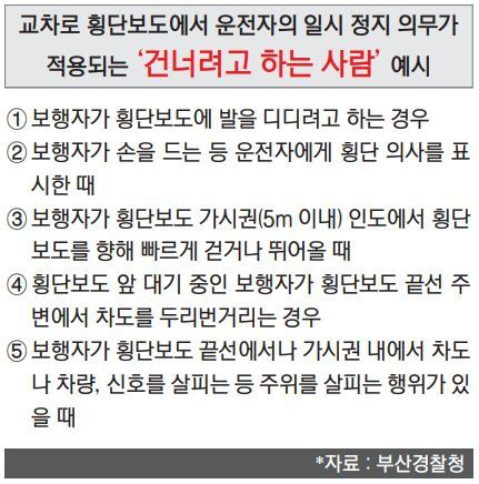 우선 경찰은 보행자가 횡단보도에 발을 디디려는 경우와 손을 들어 운전자에게 횡단 의사를 표하는 경우 반드시 운전자는 횡단보도 앞에서 일시 정지하고 보행자의 횡단이 완전히 끝난 뒤 서행 통과해야 한다고 밝혔다. 또 보행자가 횡단보도 앞에서 횡단하기 위해 대기 중일 때와 대기 중인 보행자가 횡단보도 끝선 주변에서 차도를 두리번거리는 때에도 ‘건너려고 하는 사람’에 해당돼 일시 정지해야 한다고 설명했다.