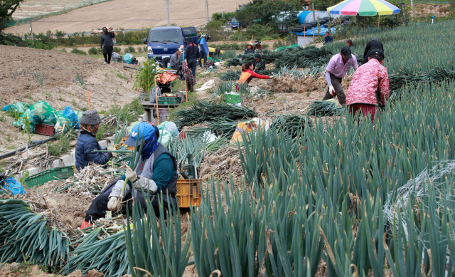 28일 강원 평창군 진부면의 한 대파밭에서 농민들이 고랭지 대파를 수확하고 있다. 올해 고랭지 대파 출하 가격은 지난해보다 1.5∼2배가량 올랐다. 연합뉴스