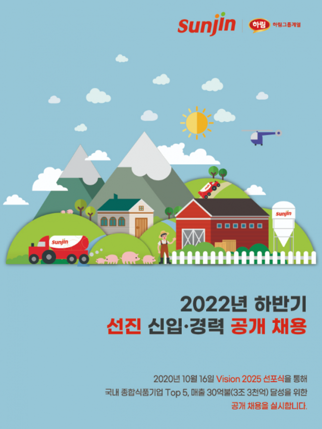 △스마트 축산식품전문기업 선진이 하반기 신입·경력사원에 대한 대규모 채용을 진행한다. 서류접수는 오는 10월 3일 월요일까지 실시한다. 사료, 양돈, 식육, 육가공 등 축산식품 산업 전 분야를 선도하는 선진은 다양한 분야의 전문 인력으로 성장할 인재를 선발한다. 지속가능한 미래 축산업을 위해 '스마트 축산'에 집중하고 있는 만큼, IT기술과 R&D 분야의 인재도 다수 채용한다. 이번 공개채용은 ▲영업 9개 부문 ▲IT 6개 부문 ▲R&D 5개 부문 ▲경영·기술관리 5개 부문 등 다양한 분야에서 32개 직무의 인재를 채용한다. 지원 자격은 4년제 대학 졸업자·졸업 예정자로 서류 접수는 선진 홈페이지 내 채용사이트에서 진행된다. 채용페이지를 신설해 기업정보와 분야별 채용내용, 공통교육 과정, FAQ 등을 정리해둬 지원자들이 궁금한 점을 상세히 알아볼 수 있도록 했다. 채용 과정은 서류전형, 온라인 인적성 검사, 1차 실무진 면접, 2차 임원면접, 건강검진 순으로 진행되며 선발된 최종 합격자는 올해 12월에 정식 입사 예정이다.