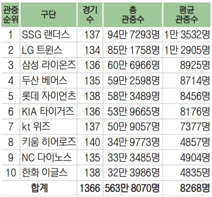 구단별로는 올 시즌 초반부터 줄곧 1위를 달리고 있는 SSG 랜더스가 94만 7293명을 기록하며 관중 동원 수 역시 1위를 차지했다. SSG를 바짝 쫓는 2위 LG 트윈스가 85만 1758명으로 2위에 올랐다. 열성팬들이 많은 롯데 자이언츠는 58만 3489명이 입장해 10개 구단 중 5위를 차지했다. 가장 입장 관중 수가 적은 팀은 한화 이글스(32만 3986명)다.