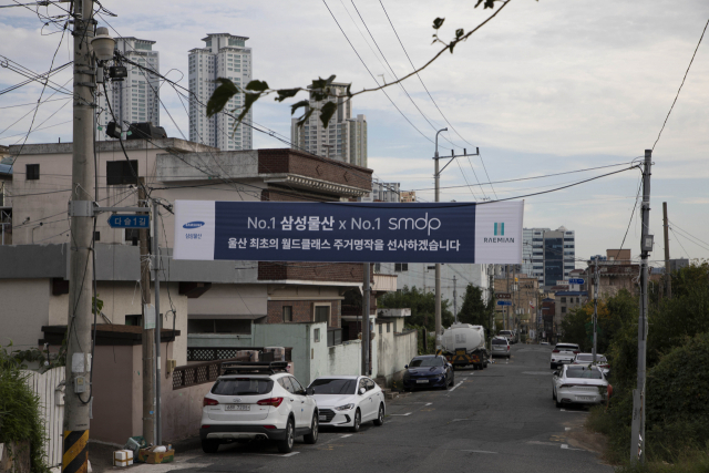 울산시 중구 B-04 재개발 사업 시공권을 두고 삼성물산과 현대건설이 격돌한다. 사진은 재개발구역 내 홍보 현수막. 권승혁 기자