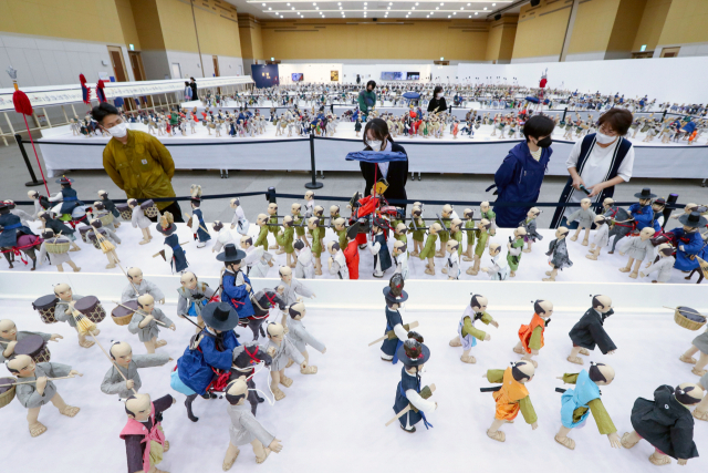 3일 부산항 국제여객터미널 이벤트홀에서 열린 ‘조선통신사 예술路’ 특별전을 찾은 시민들이 한지 인형 4000여 점으로 재현한 ‘등성행렬도’를 관람하고 있다. 전시는 오는 14일까지 열린다.