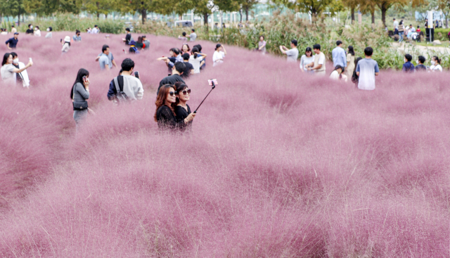 10월 첫 연휴 마지막 날인 3일 오후 부산 강서구 대저동 대저생태공원을 찾은 시민들이 서양 억새의 일종인 핑크뮬리 단지에서 사진을 찍으며 가을 정취를 만끽하고 있다.
