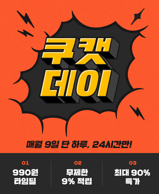 △간편식(HMR) 전문 푸드몰 쿠캣은 매월 9일을 브랜드데이 '쿠캣데이'로 지정하고, 자사 온라인몰에서 '쿠캣데이 프로모션'을 실시한다. 쿠캣데이는 매달 '쿠일(9일)' 쿠캣이 자랑하는 다양한 인기 PB(Private Brand) 제품을 파격적인 할인·풍성한 혜택과 함께 만나볼 수 있는 초특급 고객감사 프로모션이다. 매월 9일 0시부터 23시 59분 59초까지 단 하루 동안만 진행되며, 쿠캣 회원이라면 누구나 참여할 수 있다. 이달 9일 개최되는 첫 번째 쿠캣데이에서는 총 세 가지 이벤트가 진행된다. 가장 큰 이벤트는 '990원 타임딜'이다. '쿠캣 고파두부 2종', '쿠캣 뚝배기 감자탕'을 포함해 최근 고객들로부터 특히 큰 사랑을 받고 있는 쿠캣 PB 제품 총 7종을 최대 90% 할인된 단돈 990원에 구입할 수 있는 행사다. 타임딜 제품은 오전 10시부터 자정까지 2시간마다 변경되며, 각각 한정 수량 100개에 한해 선착순 판매된다. 기존의 3배에 달하는 적립 혜택을 제공하는 '쿠프로 무제한 적립' 이벤트 역시 진행된다. 쿠캣데이 하루 동안 제품을 구매할 때마다 횟수와 금액에 제한 없이 결제 금액의 9%를 무제한으로 적립할 수 있다. 베스트셀러 PB 제품에 대한 특가 할인 또한 준비했다. '쿠캣 햄폭탄 부대찌개', '쿠캣 원팩 감바스', '쿠캣 매콤크림 닭갈비', '쿠캣 딸기쏙우유 찹쌀떡', '띵커바디 식단관리 도시락 시즌3' 등 쿠캣 대표 제품 60종을 최대 35% 할인 판매한다.