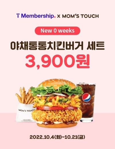 △맘스터치는 이달 21일까지 만 13세부터 만 34세까지의 SKT T멤버십 회원을 대상으로 인기 신메뉴인 '야채통통치킨버거 세트'를 52% 할인하는 프로모션을 실시한다. SKT와 협업한 '뉴 영 윅스(New 0 Weeks)'의 일환으로 실시되는 이번 행사는 외식 물가 부담이 가중됨에 따라 핵심 고객층인 'MZ세대'를 위한 통 큰 할인 혜택을 제공하고, 최근 출시한 '야채통통치킨버거'의 매력을 알리기 위해 마련됐다. SKT T멤버십 회원이라면 오는 21일까지 SKT T멤버십 앱을 통해 야채통통치킨버거세트 52%(4300원 할인) 할인 쿠폰을 다운받을 수 있다. 매장에서 해당 쿠폰을 제시하면 버거와 케이준 양념감자, 콜라로 구성된 푸짐한 세트 메뉴가 3900원에 제공된다. 전국 맘스터치 매장(일부 매장 제외) 내점·포장 주문 시 사용 가능하며, 프로모션 관련 자세한 내용은 SKT T멤버십 앱을 통해 확인 가능하다.
