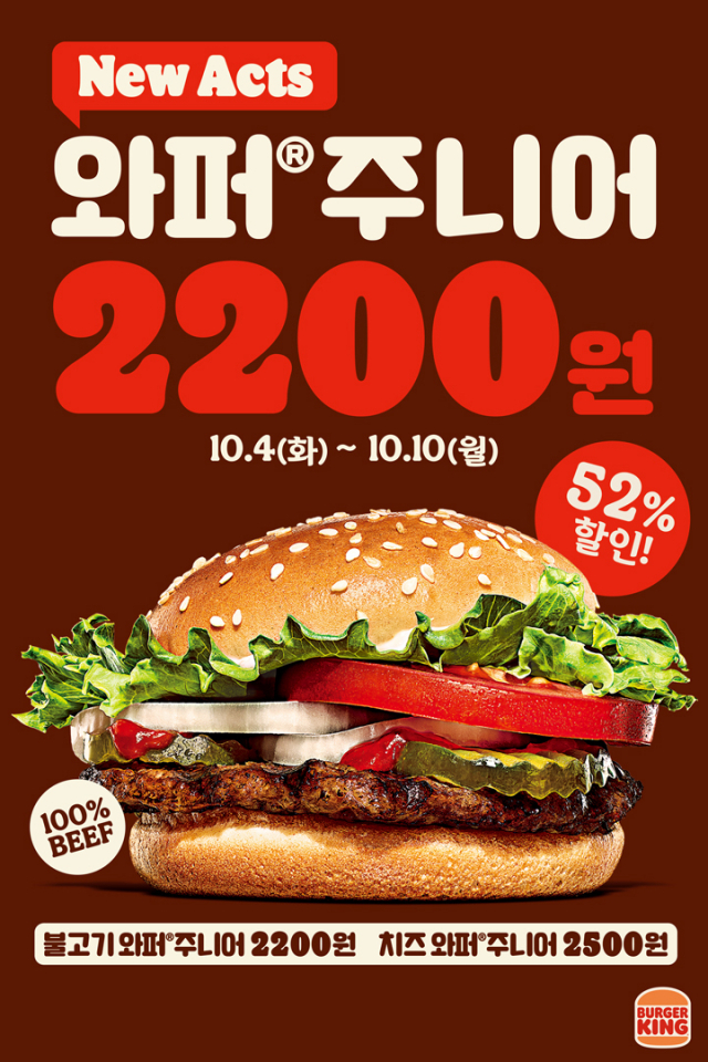 △버거킹이 가을 피크닉에서 가볍게 즐기기 좋은 와퍼주니어 3종을 최대 52% 할인하는 프로모션을 10일까지 진행한다. 대상 제품인 '와퍼주니어'는 버거킹의 시그니처 '와퍼'의 작은 사이즈 버전으로, 직화로 구운 100% 순 쇠고기 패티가 싱싱한 야채를 만나 담백하고 깊은 맛을 느낄 수 있다. '불고기 와퍼주니어'는 케첩 대신 달콤한 불고기 소스가 한국인에게 익숙한 감칠맛을 선사하며, '치즈 와퍼주니어'는 치즈덕후의 입맛을 사로잡는 고소함이 특징이다. 프로모션을 통해 최대 52% 할인 혜택을 제공한다. 프로모션은 딜리버리와 일부 매장을 제외한 전국 버거킹 매장에서 진행되며, 1인당 최대 5개까지 구매 가능하다. 다른 할인·쿠폰과 중복 혜택 적용은 불가능하며 자세한 내용은 버거킹 공식 홈페이지·SNS, 앱에서 확인할 수 있다.