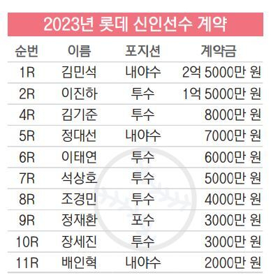 롯데는 2라운드에 선택한 장충고 투수 이진하와는 1억 5000만 원에 계약을 마쳤다. 구단은 “이진하가 우수한 체격 조건에 안정된 제구, 뛰어난 경기 운영 능력을 갖춘 만큼 체계적인 트레이닝을 거친다면 미래 선발 자원으로 성장할 가능성이 크다”고 전했다. 신인 선수 10명의 2023년 연봉은 모두 3000만 원이다.