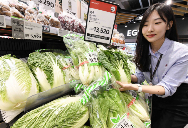 홈플러스가 ‘물가안정 프로젝트’의 일환으로 배추, 얼갈이, 열무 등 대표 김치 재료를 할인해 판매하는 기획전을 연다. 사진은 6일 배추, 얼갈이, 열무 등을 선보이는 홈플러스 채소팀 바이어. 홈플러스 제공